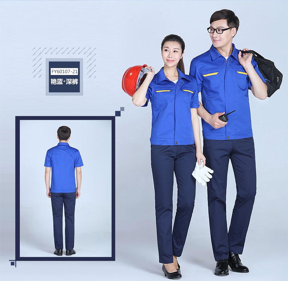 相关宝蓝色涤棉拼色口袋细斜短袖工作服FY601推荐